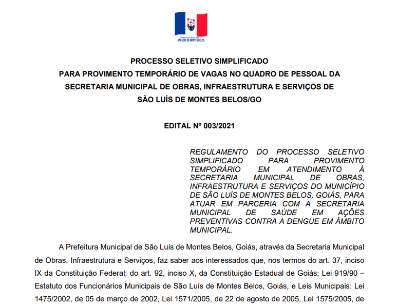 A Prefeitura Municipal de São Luís de Montes Belos, Goiás, através da Secretaria Municipal de Obras, Infraestrutura e Serviços Públicos, faz saber aos interessados que, nos termos do art. 37, inciso IX da Constituição Federal, e Leis Municipais nº nº 1475/2002, de 05 de março de 2002, Lei 1571/2005, de 22 de agosto de 2005, Lei 1575/2005, de 23 de setembro de 2005, Lei 1578/2005, de 19 de outubro de 2005, Lei 1642/2007, de 12 de abril de 2007; 1659/2007, de 15 de junho de 2007, 1814/2009, de 25 de novembro de 2009, 1827/2010, de 10 de março de 2010, e demais instrumentos legais, torna público que realizará Processo Seletivo Simplificado para provimento temporário de 35 (trinta e cinco) vagas para atuar em parceria com a Secretaria Municipal de Saúde executando ações preventivas de combate à dengue no município de São Luís de Montes Belos, Goiás, e, ainda, para formação de cadastro de reserva para aproveitamento, na medida em forem surgindo vagas, no limite de vagas ofertadas e na validade estabelecida, regido pela legislação pertinente e demais disposições regulamentares contidas no Edital Normativo e seus anexos. Inscrições no período de 25/10/2021 à 29/10/2021, exclusivamente no corredor (ambiente externo) anexo da Prefeitura Municipal de São Luís de Montes Belos, situada na Rua Rio da Prata, nº 662, Centro, nesta, no horário das 08h00min às 11h00min e das 13h00min às 17h00min. São Luís de Montes Belos, Estado de Goiás, aos 25 dias do mês de outubro de 2021.